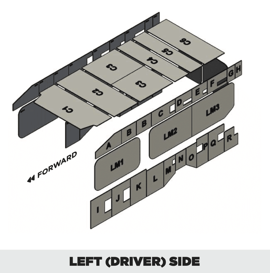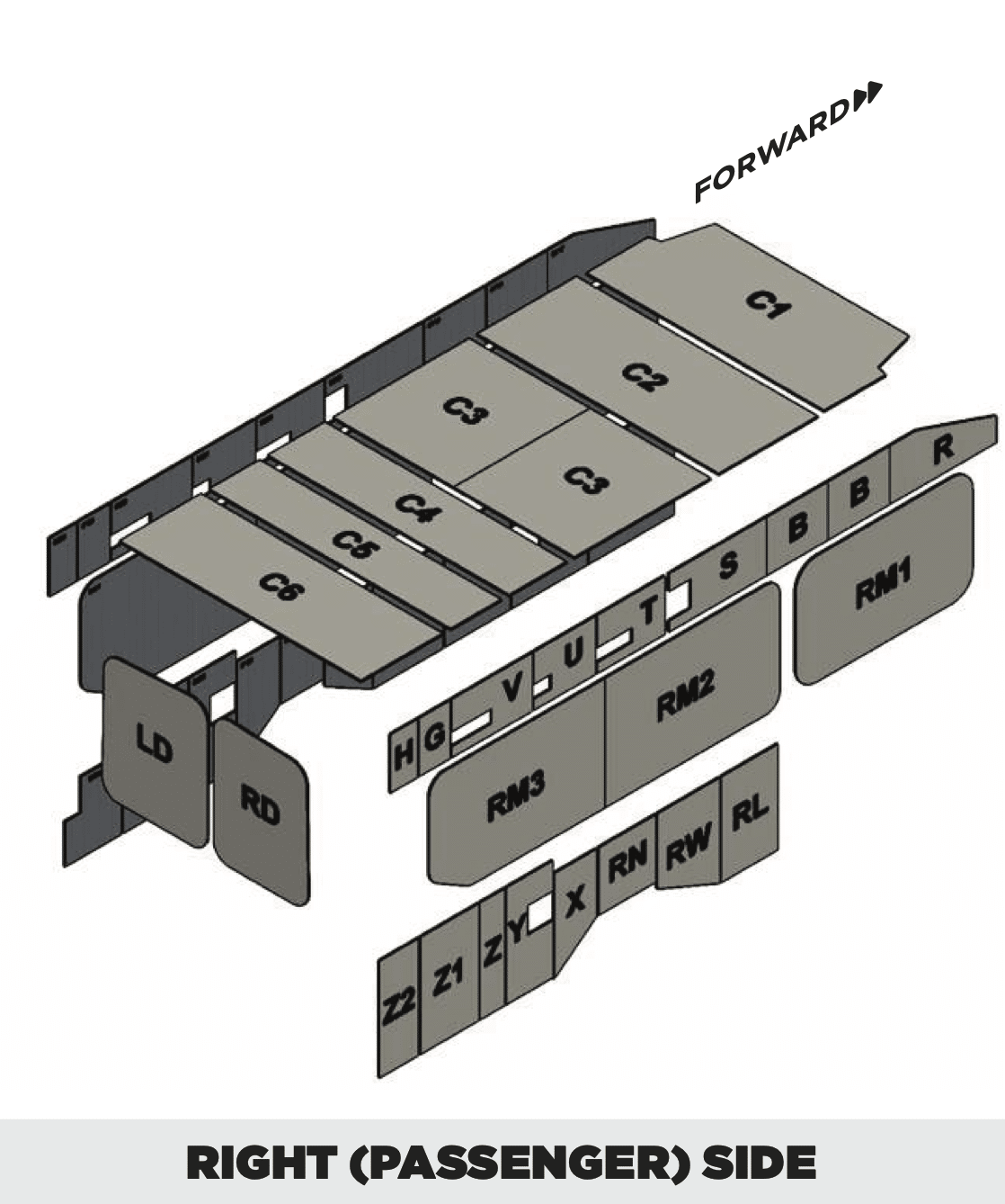 Insulation patterns are organized and packed into gaylord boxes by ceiling sets, left side sets, and right side + rear door sets. Each set is separated by a paper sheet for ease of identification during the installation process.